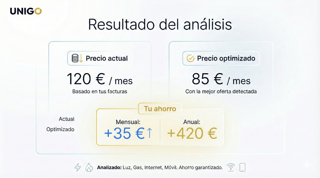 Sube una factura y UNIGO detecta oportunidades de ahorro en luz, gas, seguros e internet.