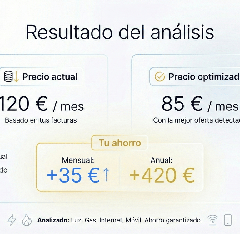 Sube tu factura y nuestra IA analiza automáticamente las condiciones de tu contrato, el tipo de tarifa y posibles sobrecostes para mostrarte cuánto podrías pagar realmente.