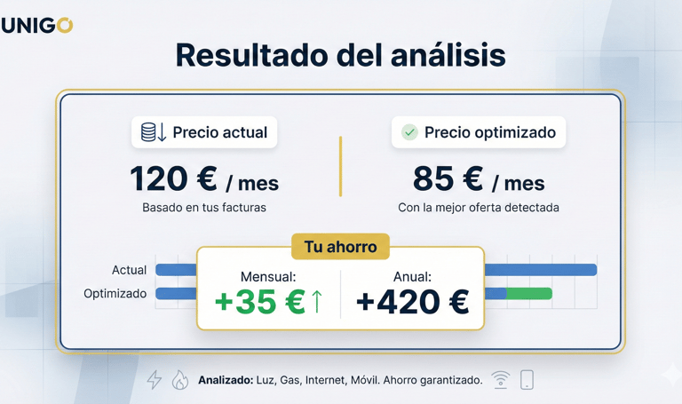 UNIGO es una herramienta inteligente que analiza tus facturas de luz, gas, seguros, internet y telefonía móvil para detectar posibles sobrecostes y mostrarte oportunidades reales de ahorro.